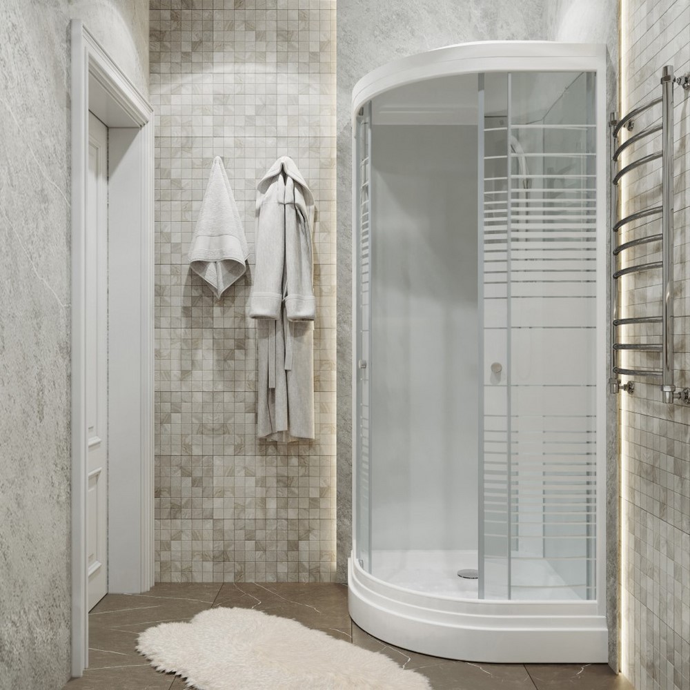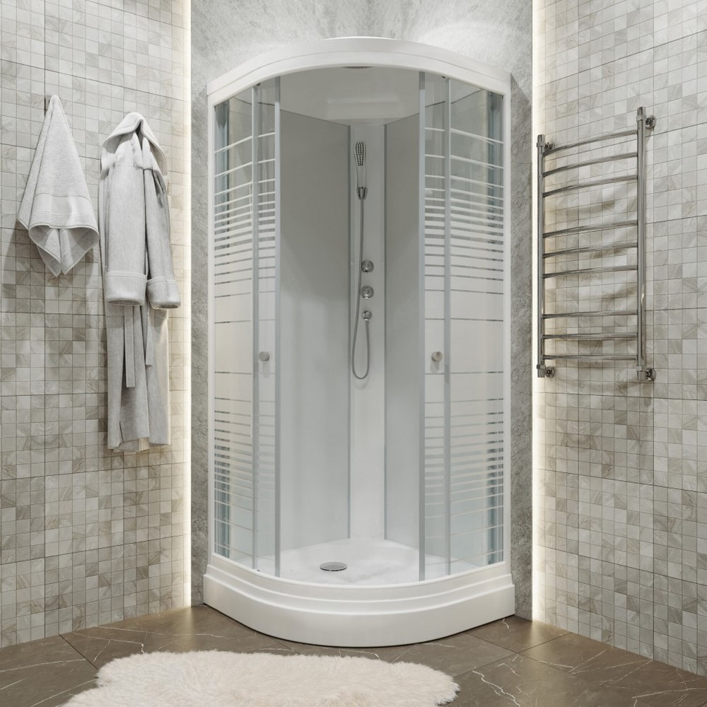 Душевая кабина Triton Полосы А имеет размеры 100х100 см. Форма — четверть круга, цвет белый, исполнение полотна двери с рисунком. Механизм открывания раздвижной. Низкий поддон.