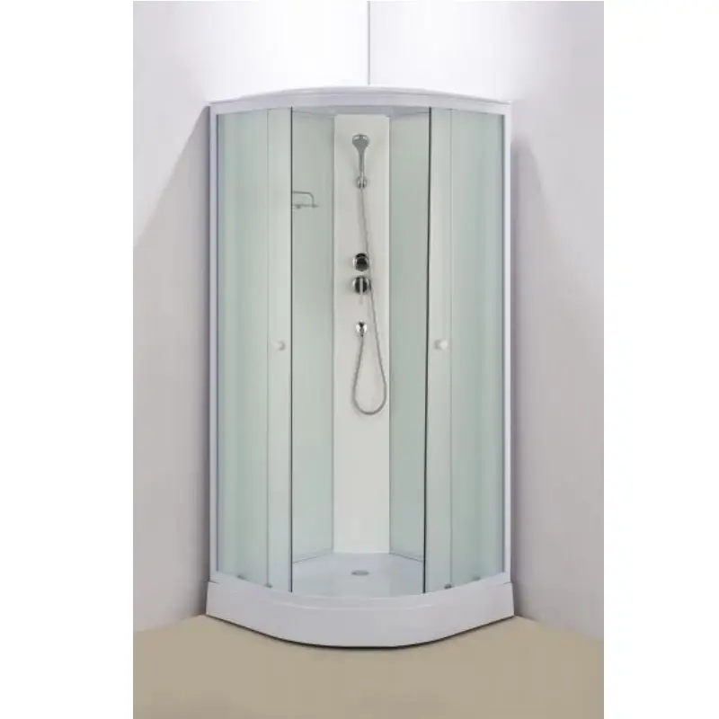 Душевая кабина Водный мир имеет размер 100х100 см. Форма — четверть круга , цвет белый, исполнение полотна двери матовое. Механизм открывания раздвижной.