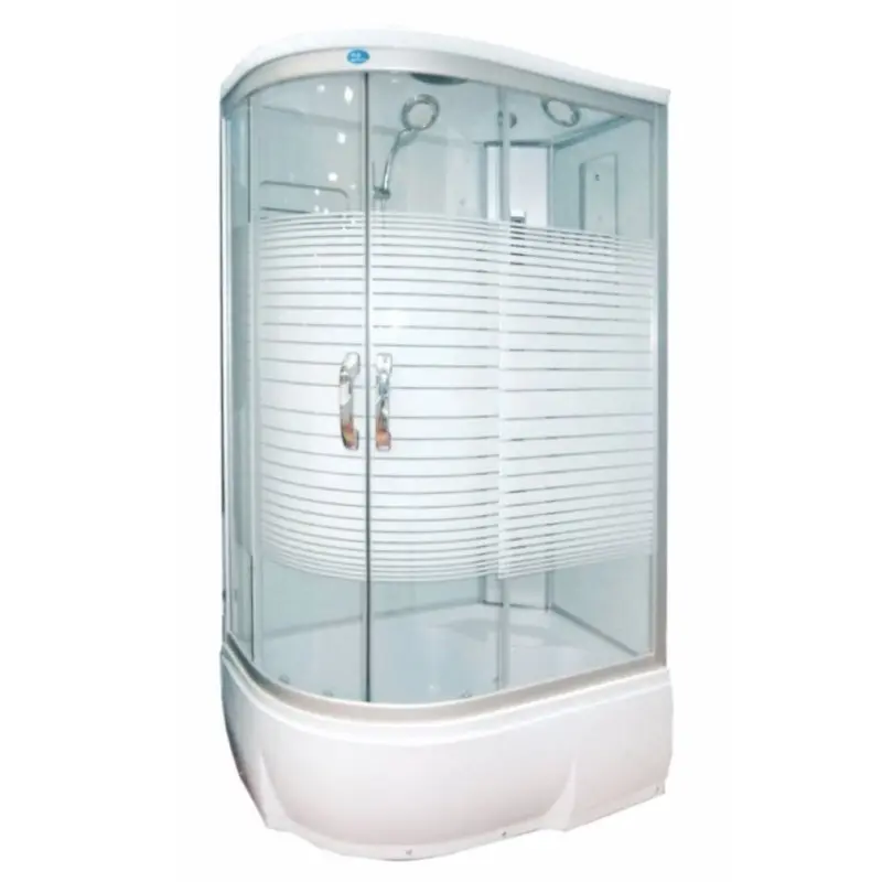 Душевая кабина Водный мир правая имеет размер 120х80 см. Форма — асимметричная , цвет хром, исполнение полотна двери матовое. Механизм открывания раздвижной.