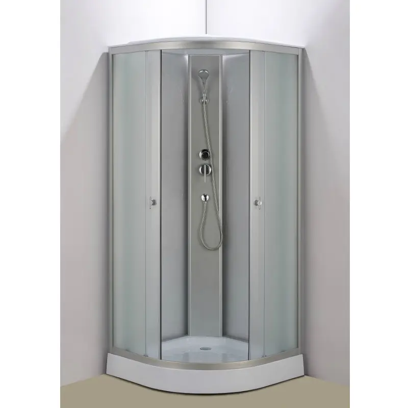 Душевая кабина Водный мир имеет размер 90х90 см. Форма — четверть круга , цвет хром, исполнение полотна двери матовое. Механизм открывания раздвижной.