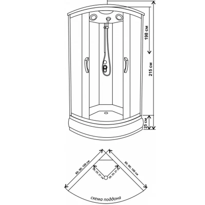 Душевая кабина Водный мир имеет размер 90х90 см. Форма — четверть круга , цвет хром, исполнение полотна двери тонированное. Механизм открывания раздвижной.