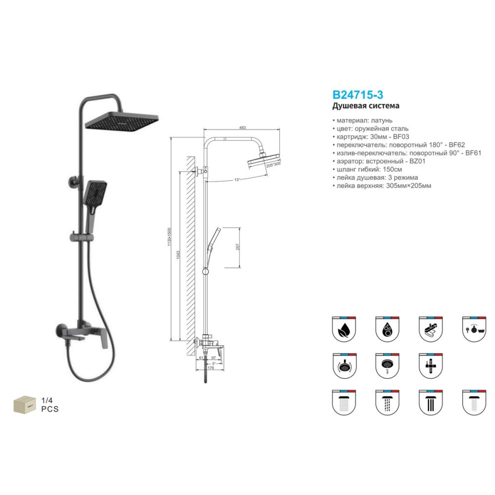 Душевая система Belz B715 с изливом Оружейная сталь B24715-3