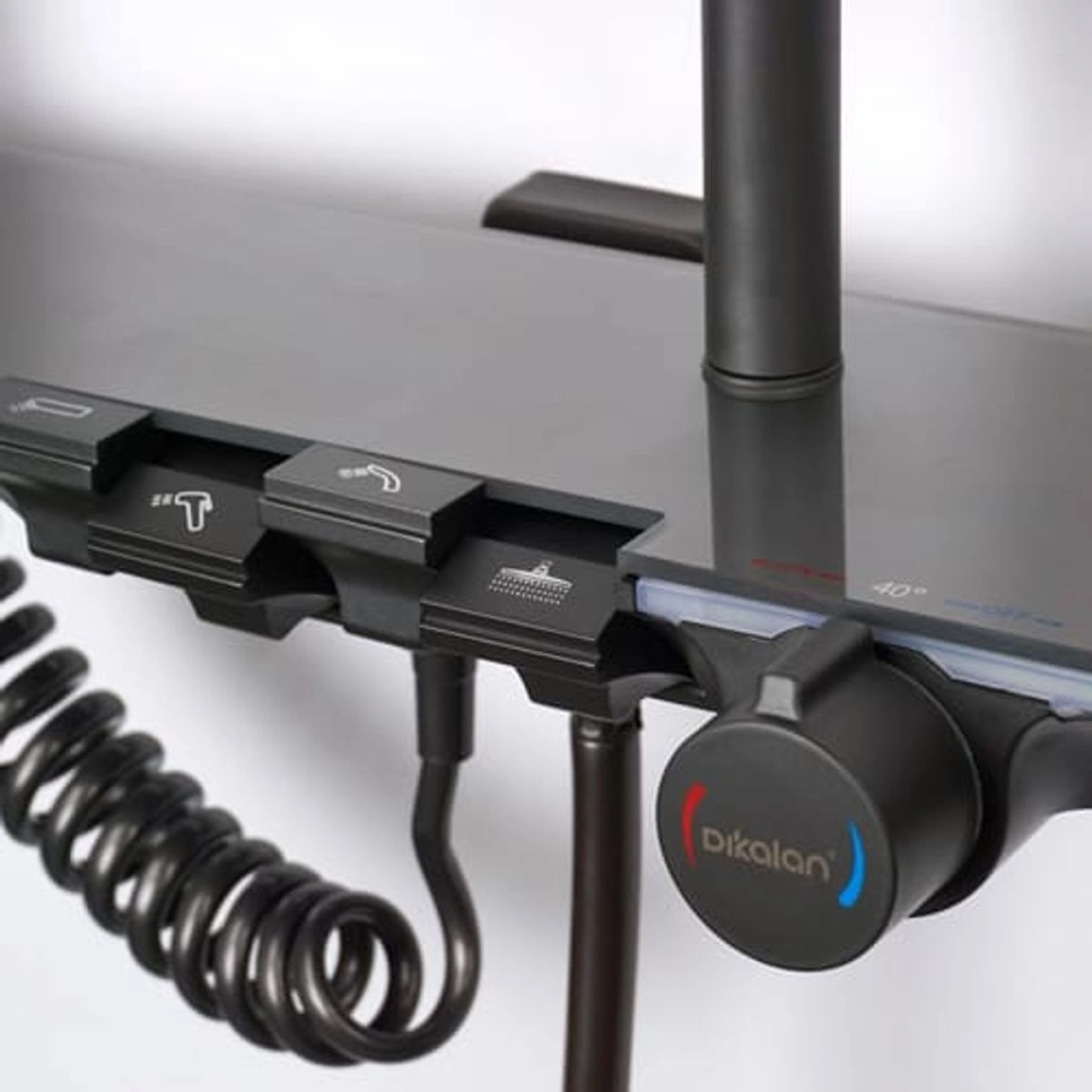Душевая система Dikalan идеальное дополнение душевой зоны. Система изготовлена из качественных материалов и имеет защитное покрытие, что обеспечивает прочность и надежность изделия. Комплектация: смеситель, излив, лейка ручного и тропического душа.